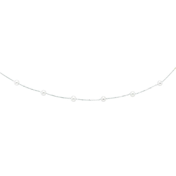 Lengths of delicate 14k white gold chain beautifully combine with classic, elegant white pearls to create this stunning necklace. Necklace is 16 and 18 inches long and closes with a spring ring clasp. Pearls each measure 6 to 6.5mm.