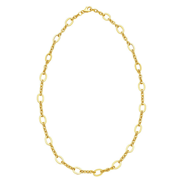 Elevate your style with our 14K Yellow Gold Five and One Oval Link Chain. This exquisite piece features a unique pattern of five polished round links followed by a single oval link, creating a sophisticated and eye-catching design. Crafted from high-quality 14K yellow gold, it offers a luxurious shine that complements any ensemble. Available in 18 inches length secured with a reliable lobster clasp, ensuring comfort and durability for daily wear or special occasions. Enhance your jewelry collection with this timeless and versatile accessory.