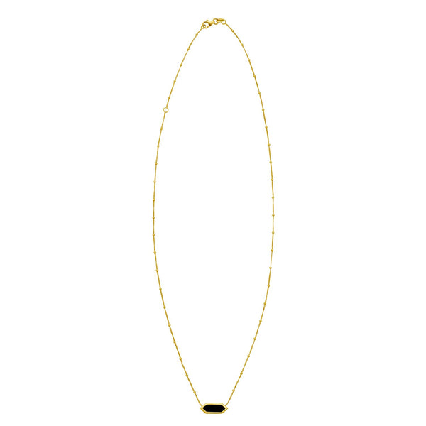 Introducing our 14K Yellow Gold Hexagon Onyx Pendant Necklace, a harmonious blend of modern design and classic elegance. This exquisite piece features a polished hexagonal onyx pendant, symbolizing strength and sophistication. The pendant is gracefully suspended from an 18 inches Saturn chain, secured with a reliable lobster clasp and an additional jump ring at 16 inches for versatile wear. Crafted from high-quality 14K yellow gold, this necklace adds a touch of luxury to any ensemble, making it an ideal gift or a cherished addition to your jewelry collection.
