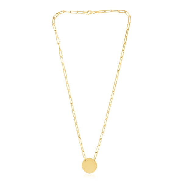This Circle Disc Paperclip Link necklace is great cross between bold & delicate. Great for layering or wearing independently, a perfect addition to add to anyone's collection. Crafted in 14k yellow gold with a high polish finish & a lobster clasp closure. Available in an 18 inches length.