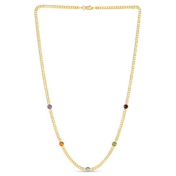 Crafted in polished 14K yellow gold, this 17 inches curb chain necklace features five stunning 4.00 mm round briolette gemstones citrine, amethyst, garnet, peridot, and blue topaz. The colorful stones add vibrant charm to the classic chain design. Finished with a secure lobster clasp, this multi gemstone necklace is perfect for layering or wearing solo as a radiant everyday statement.