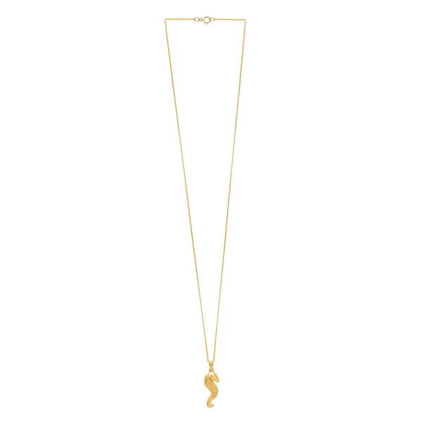 This 10k yellow gold necklace features a polished seahorse pendant, a symbol of patience, protection, and charm. Suspended on an 18 inches chain with a spring ring clasp, it combines intricate detailing with radiant gold for a piece that celebrates the wonder of marine life. Perfect for ocean lovers and those drawn to the seahorse's unique elegance.