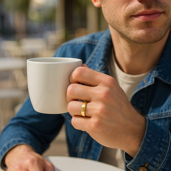 Traditional symbolism meets modern comfort and practicality in this elegant 14k yellow gold wedding band. Band is 6mm wide and is available in ring sizes 6 to 12.