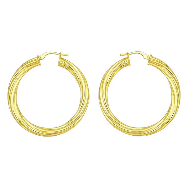 Add a bold touch of elegance to your look with these 14K Yellow Gold Polished Full Twisted Large Hoop Earrings. Featuring a striking full-twist design and a high-polish finish, they reflect light beautifully for a radiant shine. Crafted in timeless yellow gold, these hoops are secured with a hinged snap-back clasp, ensuring both comfort and style in one sleek, sophisticated piece.