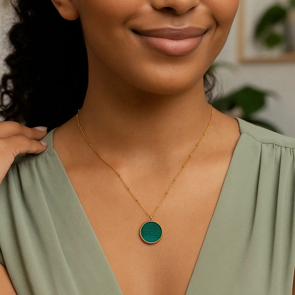 Add a touch of elegance to your look with this striking 14K Yellow Gold Malachite Inlay Circle Necklace. Crafted by Royal Chain, this polished 18 inches necklace features a sleek circular pendant accented with a vibrant green malachite inlay—offering a bold, natural contrast to the rich warmth of 14K yellow gold. The pendant is gracefully suspended from a fine gold chain, secured with a classic spring-ring clasp for a secure and comfortable fit. An additional jump ring at 16 inches allows for versatile styling—wear it long or closer to the neckline.