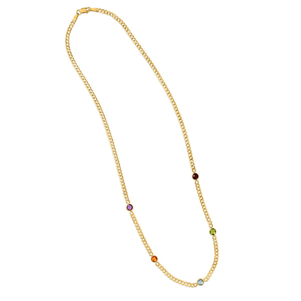 Crafted in polished 14K yellow gold, this 17 inches curb chain necklace features five stunning 4.00 mm round briolette gemstones citrine, amethyst, garnet, peridot, and blue topaz. The colorful stones add vibrant charm to the classic chain design. Finished with a secure lobster clasp, this multi gemstone necklace is perfect for layering or wearing solo as a radiant everyday statement.