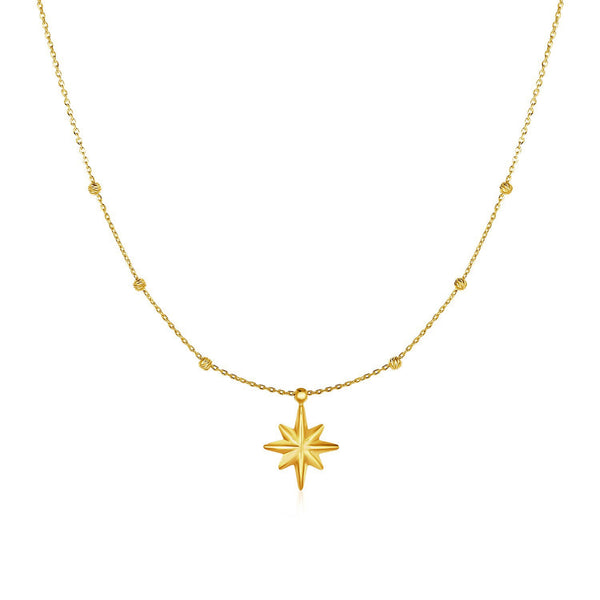 A beautiful, textured eight-pointed star and delicate beads add dazzle to this exquisite 14k yellow gold necklace. Necklace is 18 inches long and closes with a spring ring clasp.