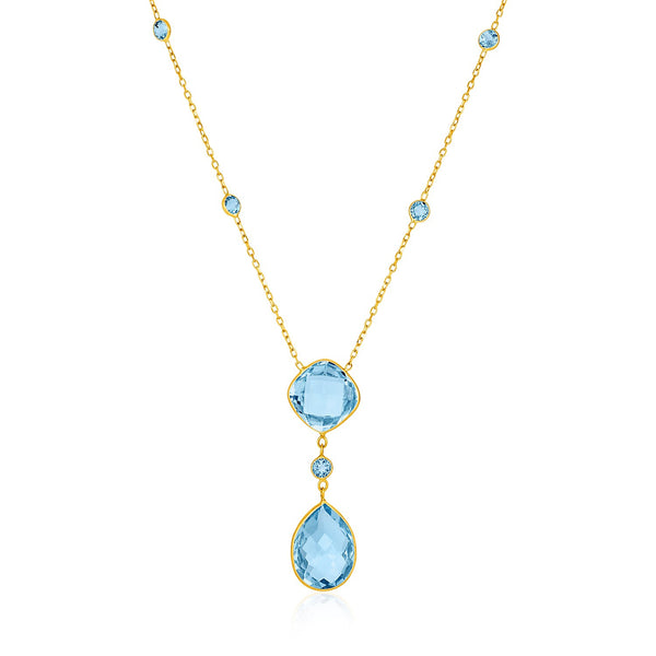 Beautiful large blue topaz briolettes hang from a simple gold chain that is punctuated by smaller stones. Necklace is 18 inches long (adjustable to 16 inches or 17 inches) and closes with a lobster clasp.