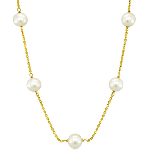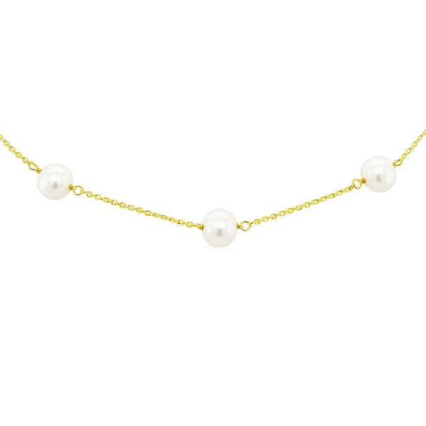 Lengths of delicate 14k yellow gold chain beautifully combine with classic, elegant white pearls to create this stunning necklace. Necklace is 16 and 18 inches long and closes with a spring ring clasp. Pearls each measure 6 to 6.5mm.