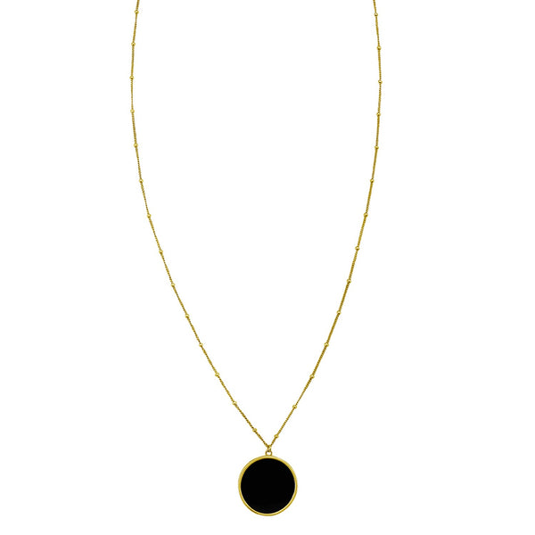 Elevate your elegance with this stunning 14K Yellow Gold Onyx Inlay Circle Necklace. Designed with modern minimalism in mind, the piece features a sleek circular pendant accented with a rich black onyx inlay—creating a bold contrast against the warm shine of 14K yellow gold. The pendant is gracefully suspended from an 18 inches chain, with a jump ring at 16 inches for versatile styling. The necklace is secured with a classic spring-ring clasp, offering both comfort and reliability for all-day wear.