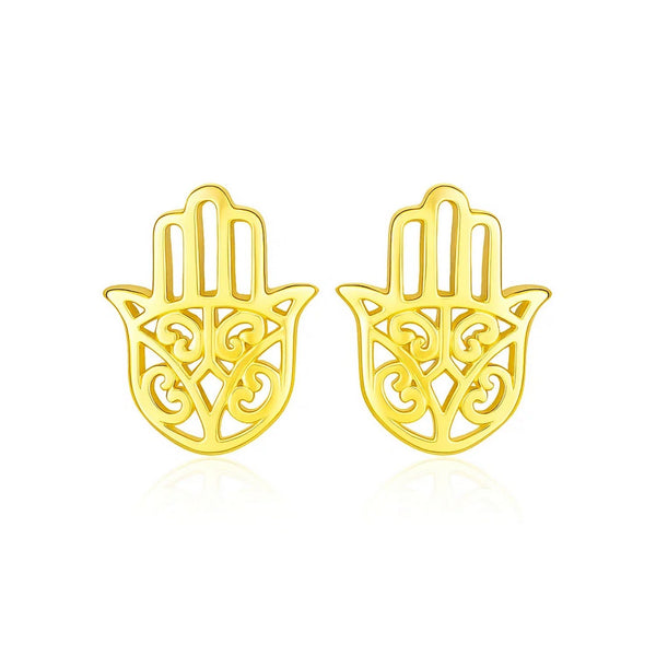 Wear these lovely Hand of Hamsa 14k yellow gold post earrings as a symbol of good fortune and protection. Post earrings are 8mm long and are held in place by pushback clasps.