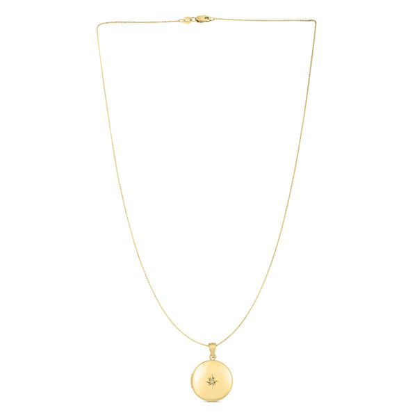 This beautiful 14k yellow gold Round North Star Locket necklace sits close to the heart. It comes in a high polish finish & closes with a lobster clasp. This stunning piece is hand crafted & sits effortlessly between a glimmering rolo chain. A small diamond perfectly placed gives you that little extra sparkle. Measuring 18 inches in length.