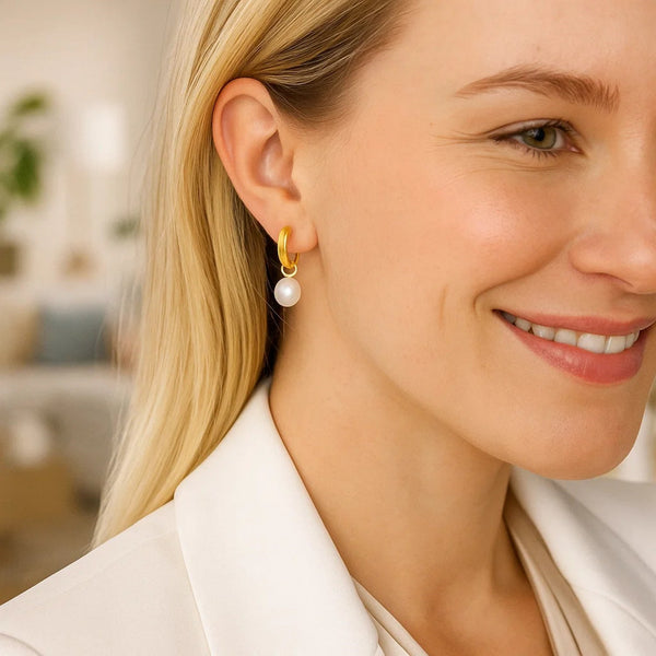 A sweet round pearl decorates each of these lovely 14k yellow gold huggie style half hoop earrings. Earrings are held in place by snap clasps.
