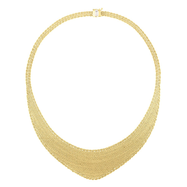 A cascade of shimmering gold defines this 14k yellow gold Cleopatra 17 inches necklace, showcasing a stunning graduated design that flows from 5mm to 30mm. The polished fancy rope construction gleams with a radiant finish, while the secure box clasp with a one-side push closure ensures effortless wear. Exuding timeless sophistication, this necklace is a striking statement piece for those who appreciate bold and elegant design.