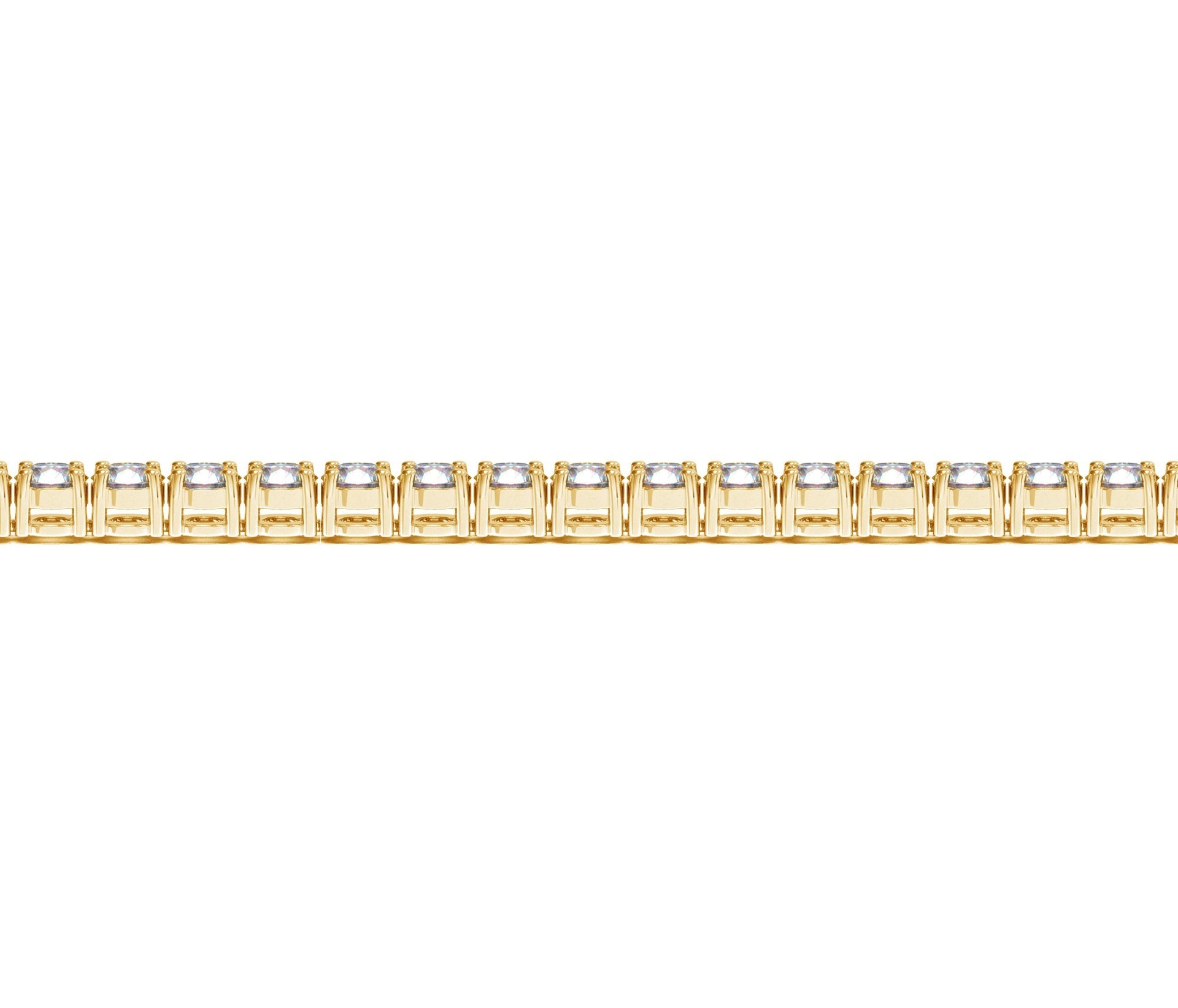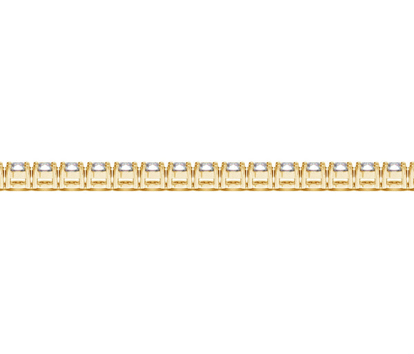Classic four prong 10 carat total weight diamond tennis bracelet showcasing perfectly matched brilliant round cut lab grown diamonds set in 14k yellow gold.