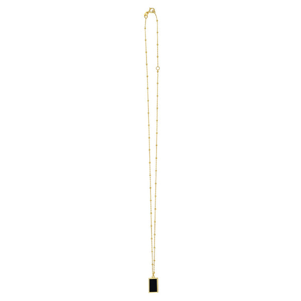 Channel bold sophistication with this 14k yellow gold geometric necklace featuring a rectangular black onyx pendant cradled in a gold frame. The delicate beaded station chain adds subtle texture, striking the perfect balance between simplicity and distinctive design, offering a fresh perspective on modern elegance. Secured with a spring ring clasp closure.