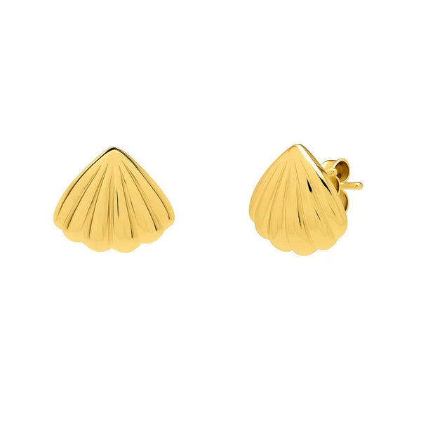 These 10k yellow gold sea shell stud earrings feature a polished scallop-inspired design, capturing the elegance of coastal treasures. Secured with a push-back clasp, they offer a lightweight and comfortable fit, making them a radiant accessory for ocean lovers and beach-inspired styles.
