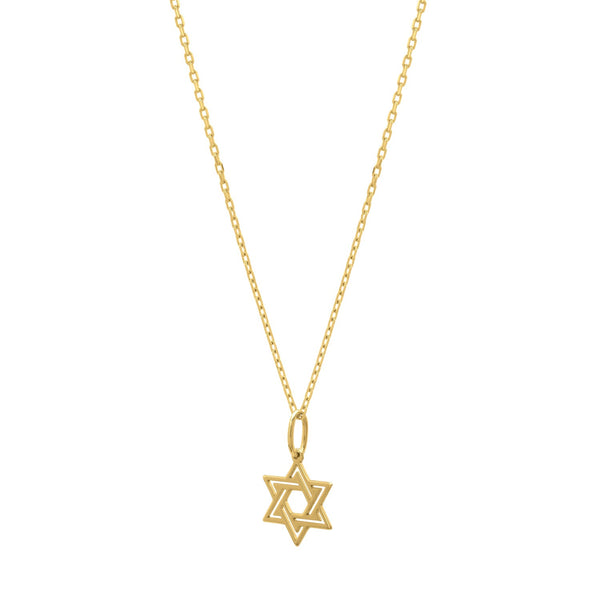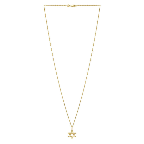 A finely detailed cut-out Star of David is the centerpiece of this 14k yellow gold necklace, showcasing the intricacy of its design. Paired with an 18 inches cable chain, the star pendant, combining tradition and artistry, serves as an expression of faith and heritage. Secured with a lobster clasp closure.